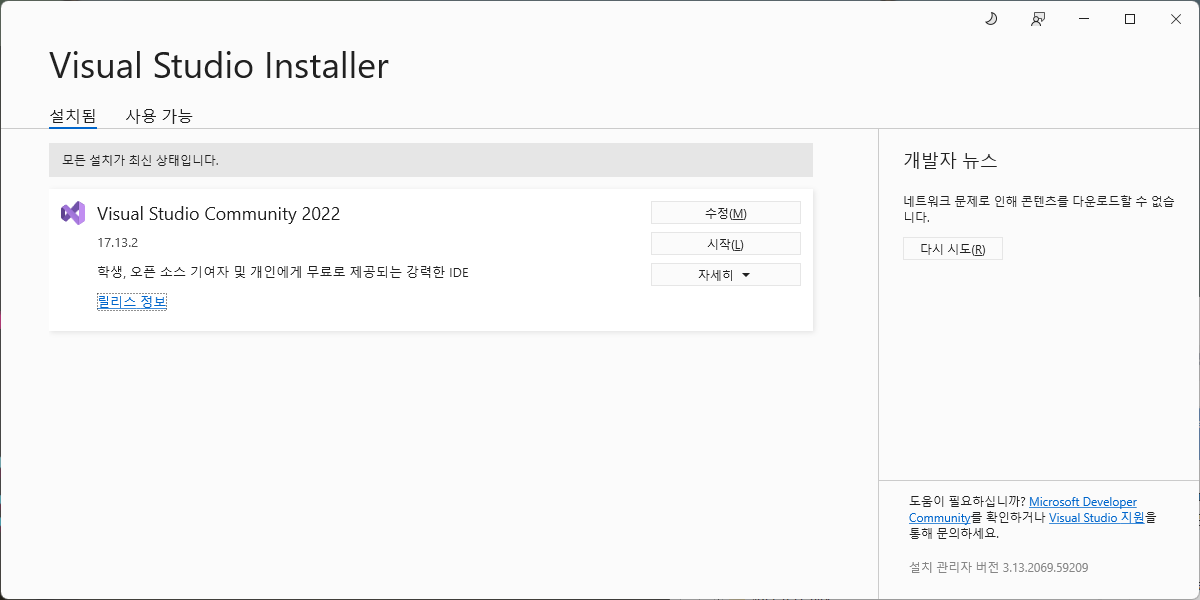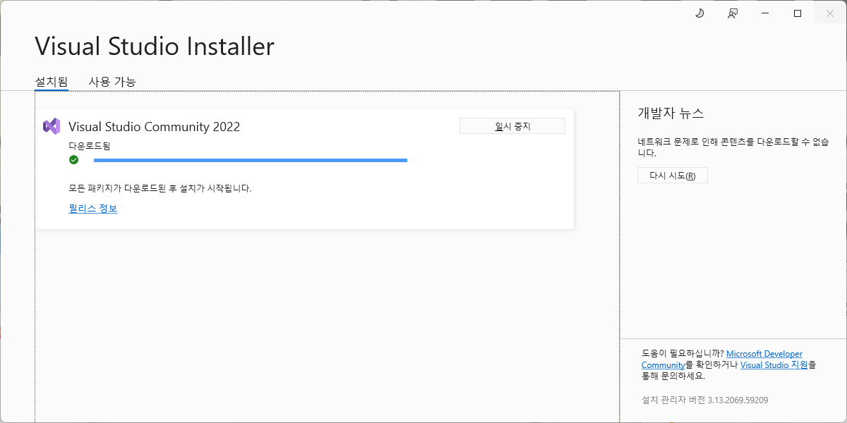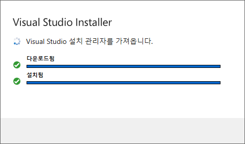 - Visual Studio Installer, 다운로드됨 설치됨이 뜨고 다음으로 진행됩니다.