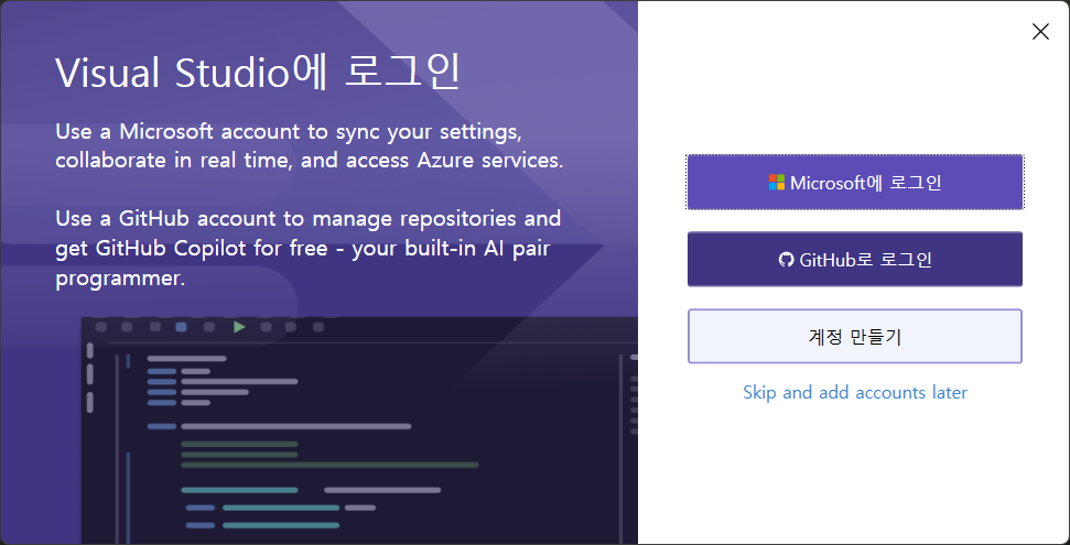- 오프라인 모드에서는 로그인이 불가능하니 때문에, 아래와 같이 "Skip and add accounts later"를 선택하여 넘어갑니다.